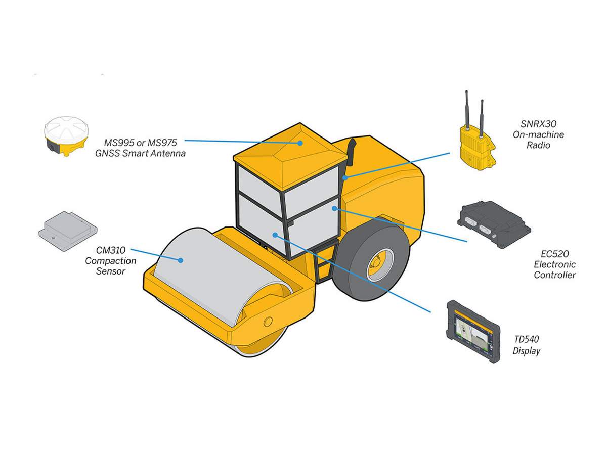 Trimble GNSS maskinmodtagerne MS995 eller MS972 bestemmer komprimeringens position med en nøjagtighed på få centimeter. Positionsdataene bruges til at dokumentere overkørslerne og beregne den samlede arbejdsgang.